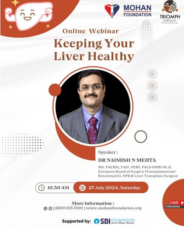 On July 27, 2024, TRIOMPH and MOHAN Foundation organized a webinar cum interactive session on ‘Keeping your Liver Healthy’. The webinar was presented in collaboration with the SBI Foundation. The purpose of the webinar was to bring valuable insights and knowledge to audience about importance of liver health, treatment modalities in case of liver failure, care of liver after transplant.